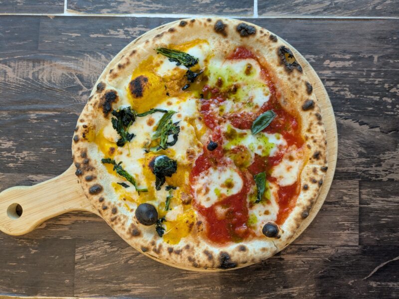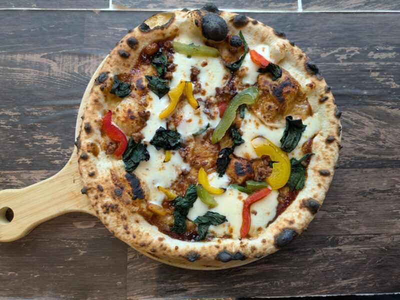 間伐材を圧縮したペレットという燃料を使用しているため薪特有の木の香りもあり、石窯の遠赤外線効果により、外はサクッと中はモチモチのピザが特徴です。
