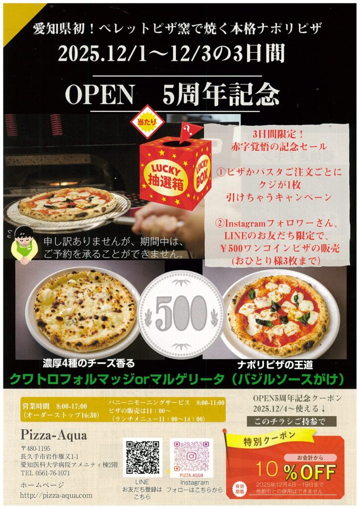 (ピザ無料券・サイドメニュー無料券・オリジナル焼き菓子などが当たる!)
