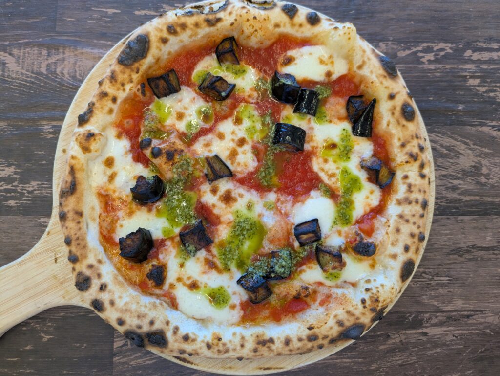 一口大のナスを、素揚げしました。とろっとした食感はがモチモチピザ生地によく合います。