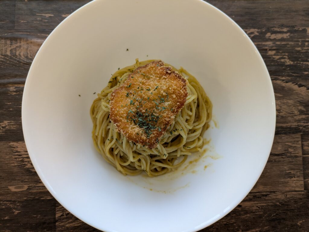 シンプルなカレーソースをパスタにからめて、揚げたてのチキンカツをトッピングしたパスタです。