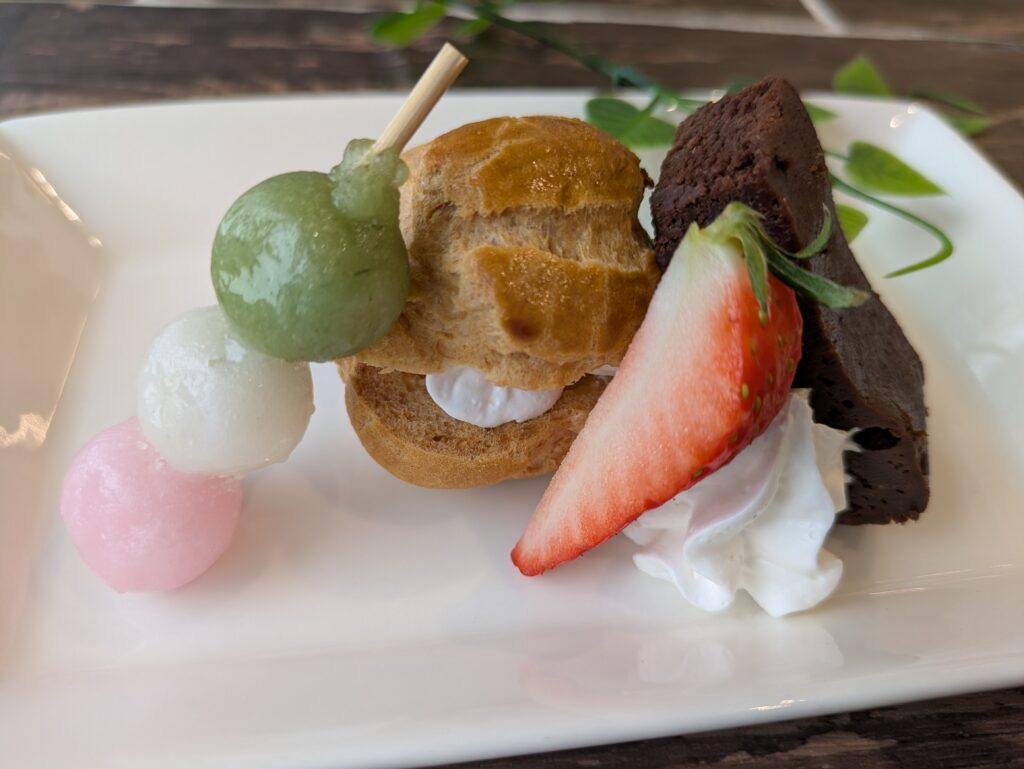 ご注文のお客様へ、翌日のひな祭りのため、「ミニ三色団子とミニスイーツ盛合せ」プレゼント!
