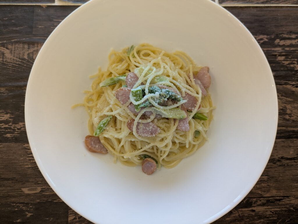 この季節、みずみずしくて美味しいアスパラと、ソーセージを使ったクリームソースパスタ。