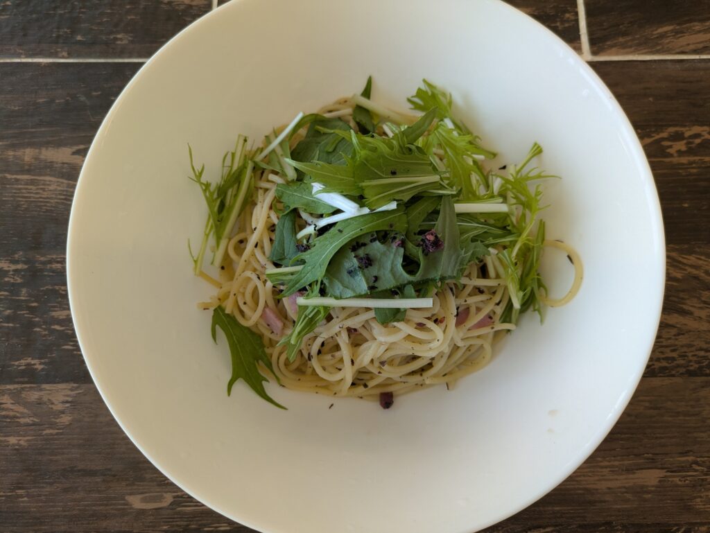 ●水菜とベーコンの梅風味ペペロンチーノパスタ